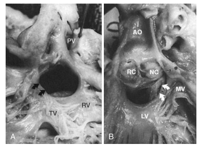 Enquanto que a valva aórtica está relacionada a margem superior do defeito, o sistema de condução está muito próximo da margem inferior.