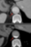 Observem que a falsa luz na fase arterial da angiotomografia (imagem superior) usualmente se apresenta menos densa em comparação à luz verdadeira, devido ao seu menor fluxo. Entretanto, na fase tardia ela irá se apresentar realçada por conta do menor escoamento do contraste (imagem inferior).