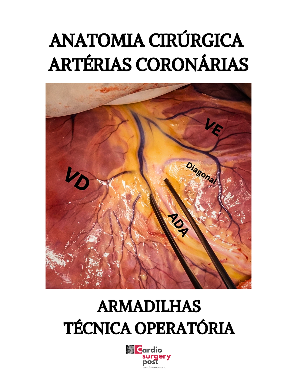 Tipo de acidente que não pode ocorrer durante a revascularização do miocárdio, especialmente na ADA: sutura inadvertida da parede posterior da coronária. Claramente, esse tipo de complicação vai comprometer o fluxo coronariana e a qualidade da cirurgia. A ADA Pode ter origem anômala da coronária direita, cruzando o infundíbulo do ventrículo direito - é um problema enorme nas correções cirúrgicas da tetralogia de Fallot devido a necessidade de ampliação da via de saída do VD.